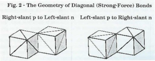 If the planes of symmetry of two collapsed voids (of two defect-pairs) lie in the same cardinal plane of the lattice, we perceive that they could position themselves such that the axis of contraction of one lies in a lattice face-diagonal direction from the axis of expansion of the other (i.e., they possess opposite slants). In this configuration, their two residues of E/C distortion will partially cancel each other, and a bond will be established between them. In Fig. 2, below, I show the geometrical relationships between two nucleons (represented as T-slant cubes) that result in the formation of a diagonal bond between them: