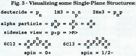 ഀ ഀYou will notice in the following nuclide structures that the orthogonal dual-proton "notches" are normally unoccupied. These are avoided by plane 2/4 neutrons because a neutron siting in these orthogonal dual-proton "notches" would develop two repulsive db's and only one attractive db, because this neutron's T-slant form would be the same as the two proton's. You will perhaps see, however, that these "notches" can become the dominant interplane bonding locations simply by reversal of all the "slants" of all the 2/4 plane neutrons. There is good evidence that this sometimes occurs among elements whose proton placements assume a completely-filled rectangular form. The clue for this binding direction shift is the presence of two nearly equally abundant stable isotopes that are four A-numbers apart.