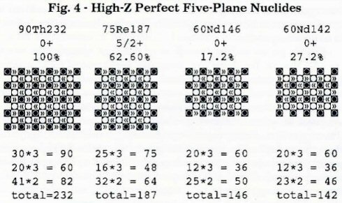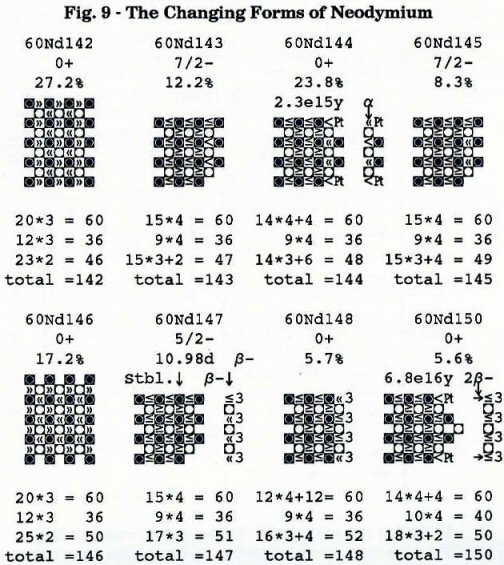 ഀ ഀYou will recall that these two Neodymium structures were among the four "completely saturated" nuclides that I presented as Fig. 3. This switch in the location of the "notch" neutrons is not the only interesting aspect of neodymium. All the rest of its stable isotopes are seven-plane structures, and these seven-plane isotopes also show a wealth of structural variations among themselves as A-numbers increase and alternate between even and odd: