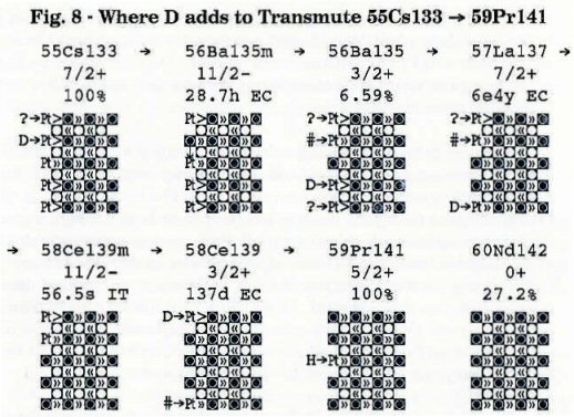 ഀ ഀThe Fig. 8 structure of praseodymium makes it obvious why 59Pr141 is unable to capture a D: There is no suitable bonding location for the deuteride neutron, because the plane 4, 2nd column, row 5 neutron location is already filled. There is, however, a strong bonding site for a proton, which would produce 60Nd140, but this addition doesn't seem to happen. What prevents this? Here is a puzzle, because even the purest deuterium gas will inevitably have light hydrogen mixed with it. So what keeps these protons from bonding to 59Pr141?