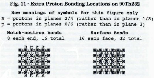 ഀ ഀBut we have overlooked one other bond possibility: there are neutrons in the next row inward from the surface, which have the same slant as the attaching proton, and with which the proton can form an attractive paraxial bond. This seems to create a bonding situation that meets our requirement for "gentleness" --- just one bond holds each proton to the exterior of the thorium structure!