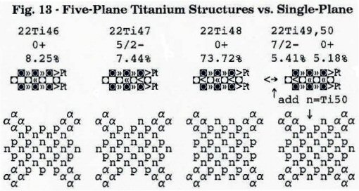ഀ ഀ ഀAs I mentioned in the Abstract of Investigation #4, the nuclei that result from the electrolytic fractionation of 90Th232 lie in the intermediate region between single plane and multiple plane structures. Thus, it behooves us to look at both structural possibilities for the various titanium isotopes that were detected in the end products of electrolysis, to see if we can find a reason or an argument to prefer one structural mode to the other. I take up the reason first:
