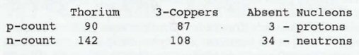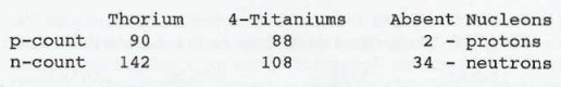 One interesting thing we can infer from these data is that there are enough neutrons left over in both examples to create 29Cu63, if we could just find a way to bring 27 or 26 protons to thorium's perimeter, and get them to bond to it. And not just to bond, but, to attach in such a gentle manner that successive additions do not strip off those already attached, until all the 27 (26) arriving protons have established their bonds.